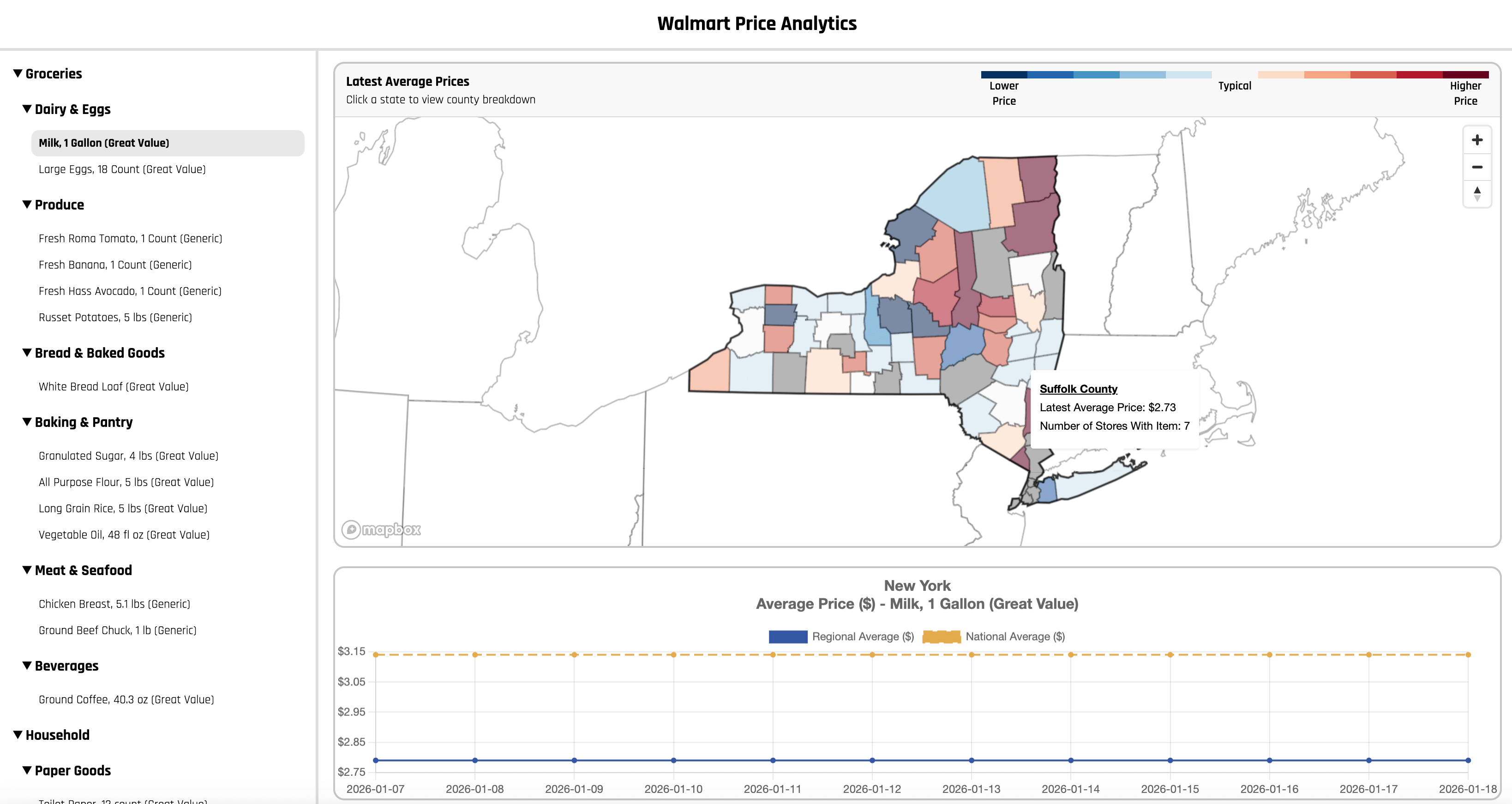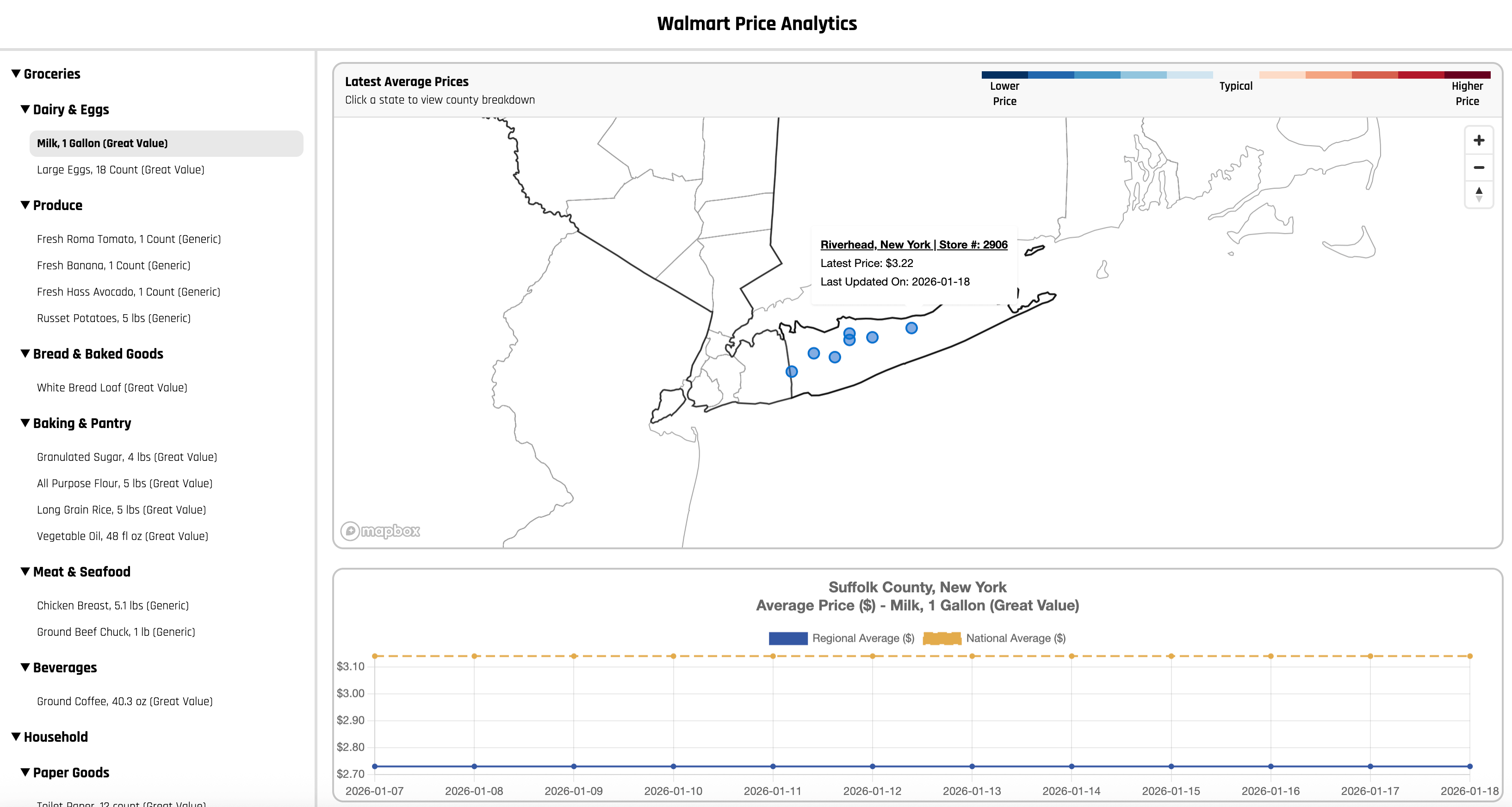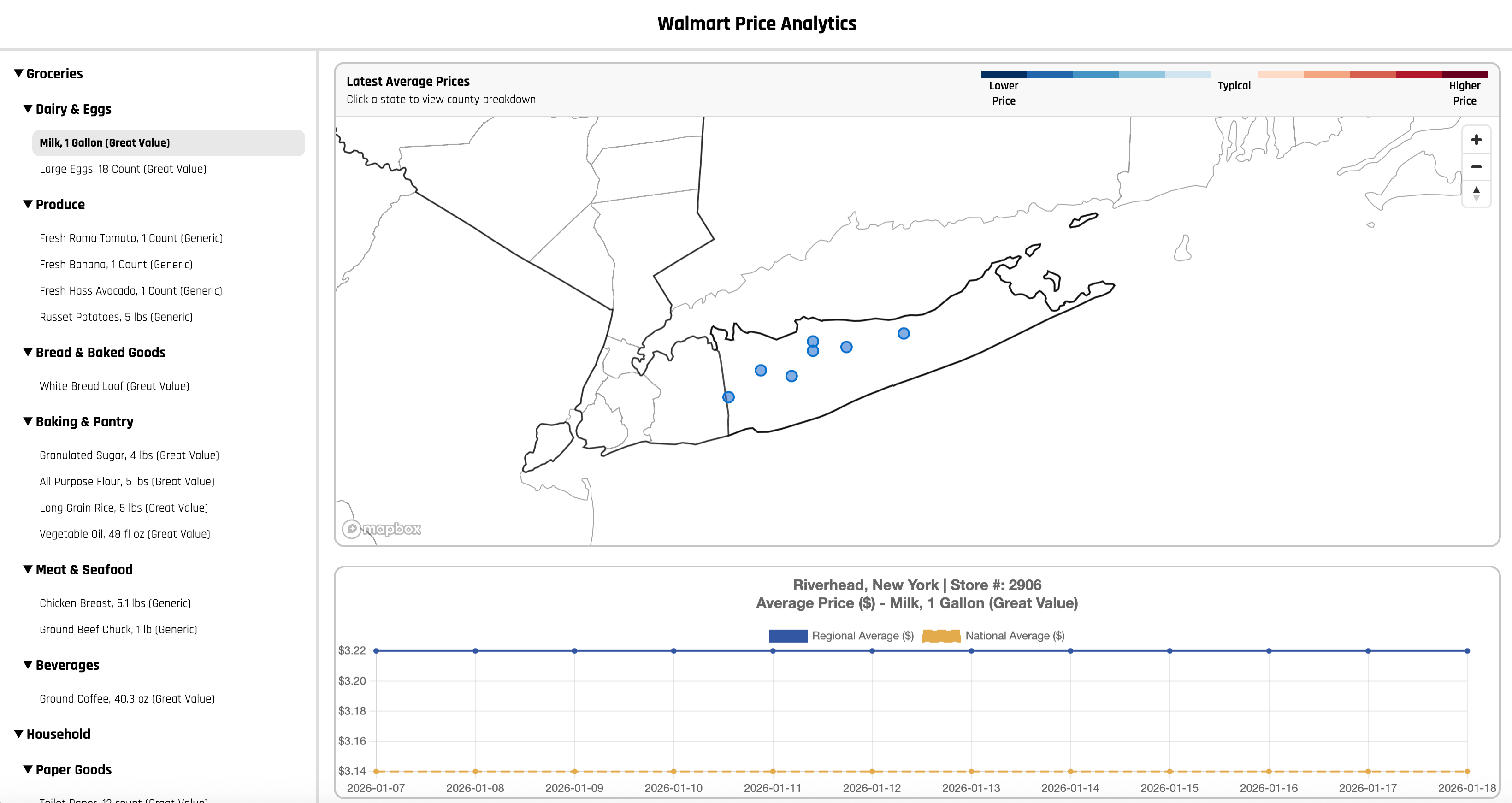 Fetches daily Walmart prices for common household groceries across ~4,000 stores in the United States. The data is aggregated into state and county level averages and visualized with interactive maps and trend charts.